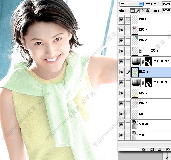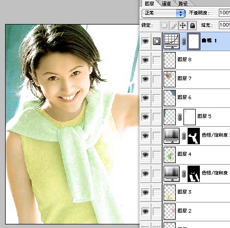 第五,上色大体思路我认为仍然是从整体到局部,再由局部到整体。比如这张照片。我们要先从整体出发,考虑好这个MM的环境,和她自身的特质。健康阳光,很有活动。这时我们就要为他设计色彩。就这张照片而言,我个人觉得应该以清新的浅色为主,淡黄,淡绿的搭配由此产生,在这幅图中,环境色很少,这时我们可以把主要精力放在人物上,而环境色只要能和人物衣服色搭配合适就行了。设定完总体的颜色。再进行实际的局部上色。中间的步骤下面会有一些截图,希望大家看了能有所领悟,具体的我不细说了。因为已经有很多这方面的教程了。最重要的一点是要细心。我用的方法是最笨的方法。就是一块块的用钢笔扣出来,头发部分用配合通道来扣。然后一个图层一个图层的上色。先填充一层基本色,然后再用喷笔上明暗调,上色的图层所用的图层模式为[颜色]。当这些都进行完以后。大体上颜色就上完了。有些盟友这时就交稿了。慢着。这还没完。因为我们一部分一部分的上色。最后的成品肯定不是非常的自然。这是肯定的。所以最后还要有一步,在最顶层加一个色彩整体调整层。我的习惯是用[曲线]调整层。“便宜量又足,曲线,我一直用它??!”。这时才算是完工了。总之知识是死的,人是活的,不要死背教程。 |