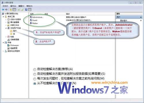 ① 右键“计算机”,点击“管理”,系统会弹出“计算机管理”界面。在“计算机管理”界面左边窗格在双击“本地用户和组”,再点击“用户”,“计算机管理”界面中间窗格就会显示计算机里的所有用户帐户,其中名称与安装系统时输入用户名相同就是当前使用的管理员用户帐户。