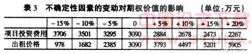 影响。假设项目投资费用和出租价格的变化率分别为+5%、+10%、+15%、-5%、-10%。不确定性因素的变动对期权价值的影响情况,见表3。