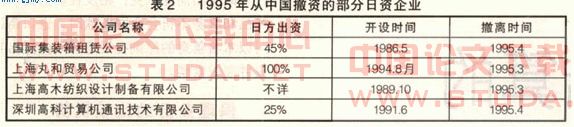 日本。日本经产省直属的日本贸易振兴会2002年的一项调查显示:在中国的日本三资企业6—7成为盈利,2成左右收支平衡,1成多为赤字或撤退。可见,日本在华投资企业的撤退比例是偏低的。以1995年为例,日本企业从中国撤资总数为8家,居日本海外撤资排序的第9位,占其当年全部撤资比例的3.1%。详细情况见表2。