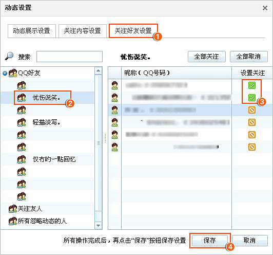 第三步:在好友的昵称后设置为打勾“”表示关注该好友;好友的昵称后设置为“”表示忽略该好友动态,再保存即可。