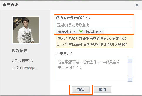 注:好友QQ上会收到相关提醒,需要好友确认赠送音乐。