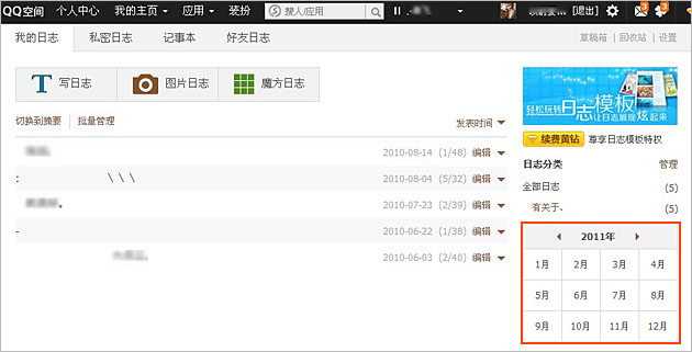QQ空间日志增加“按日期”分类的功能,在您的日志列表的右侧操作栏中,点击日志列表中日历的月份,即可看到当月的日志。如图: