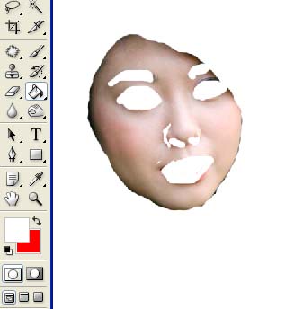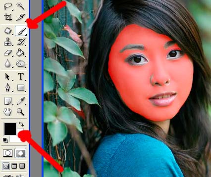 下面我们用它把mm的面部皮肤选出来,点那个钮,选画笔,前景色为黑色,涂你要磨的部分,涂过界的用白色画笔涂回来,来回涂是不是很方便? |