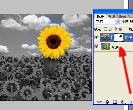 比如局部去色:假如我们想做出只有一朵葵花有颜色的效果。首先复制一层,将复制层去色,添加蒙版,涂出葵花就行了。 |