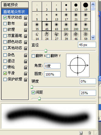 1、选择画笔,打开画笔预设面板,选择画笔形状,我用的是 柔角45 选择形状动态 大小抖动稍微调一下就好了。 |