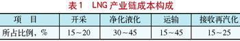 LNG(液化天然气)项目的天然气供应成本主要由天然气开采费用、净化液化费用、运输费用以及接收再汽化等费用构成。根据资源状况、运距等的不同,各项费用所占比例变化范围很大(见表1)。
