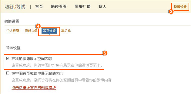 2、“微博设置”=》“其它设置”中增加展示设置项,若设置了“在我微博展示空间内容”;
