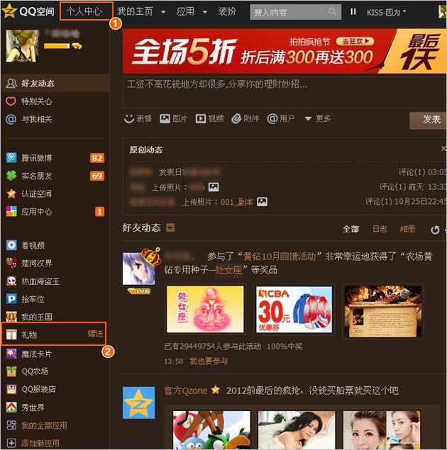 方法二:登录QQ空间后,点击“个人中心”我的应该下方选择“礼物”。
